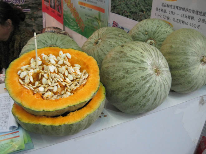 籽用型印度南瓜雜交種。在適應(yīng)區(qū)生育日數(shù)105天左右,活動(dòng)積溫2100℃左右。該品種植株生長健壯,葉色深綠,分枝弱,坐瓜能力強(qiáng),成熟瓜灰綠色,瓜扁圓形,單瓜重4公斤左右。單瓜產(chǎn)籽300-400粒,瓜籽雪白色,籽粒寬1.3厘米左右,籽粒長2.3厘米左右,百粒重40-45克。
